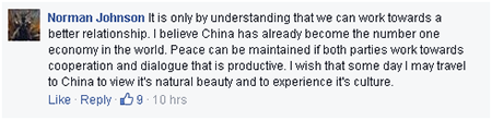 Norman Johnson (os EUA): Somente com o entendimento mútuo podemos criar uma amizade melhor. Acredito que a China já se tornou a maior economia do mundo e os dois países v?o cooperar e diálogar de forma eficaz, e defender a paz. Espero que um dia eu possa ir à China para conhecer pessoalmente as lindas paisagens naturais e a cultura do país.