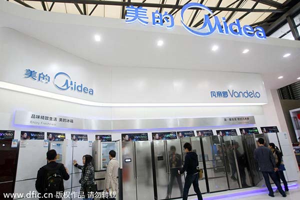 Visitantes olham os refrigeradores da marca Midea durante a Appliance World Expo em Xangai. Foto de mar?o de 2014. [Foto/IC]