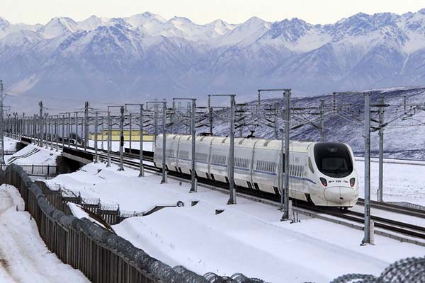 5. Na ferrovia Lanxin, que liga Lanzhou, capital da Província de Gansu, com a Regi?o Aut?noma Uigur de Xinjiang, um comboio de alta velocidade realiza viagem piloto na Montanha Qilian, com uma altitude de 3.300 metros, a 5 de dezembro de 2014.