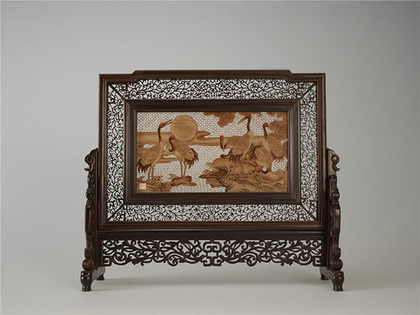 Painel de sandalo perfurado e cravado, onde é possível ver um grupo de gar?as-azuis – símbolo de longevidade na cultura chinesa. A inscri??o no canto em ambos os lados lê-se “Jixiang” e “Ruyi”. As duas palavras, quando lidas de forma escorreita, formam o significado “boa sorte, quando assim necessitar”.
