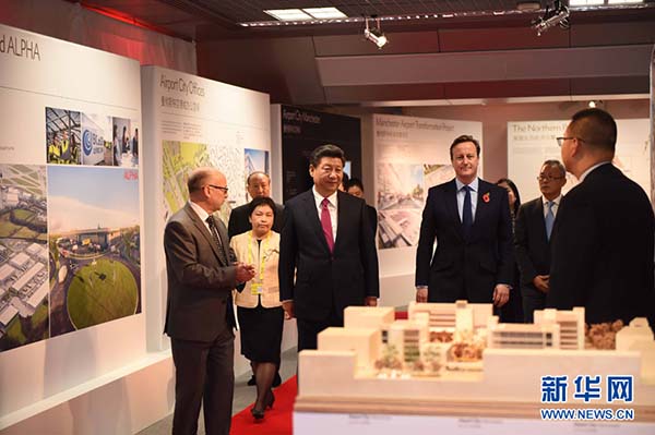 David Cameron e o presidente chinês Xi Jinping visitam a exibi??o de fotos dos planos de desenvolvimento do aeroporto de Manchester, a 23 de outubro de 2015.