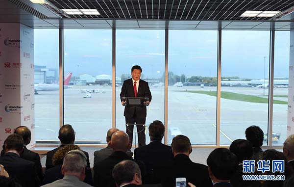 Acompanhado por David Cameron, o Presidente Xi visita o projeto do aeroporto de Manchester, onde proferiu um discurso, a 23 de outubro de 2015.