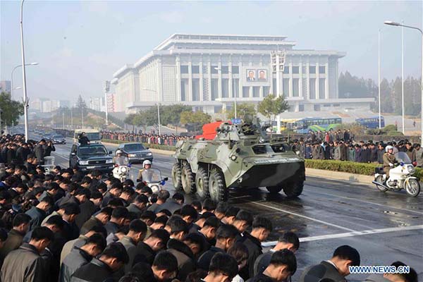 Foto fornecida pela KCNA no dia 12 de novembro de 2015 mostra equipe de servi?os e pessoas comuns expressando condolências e oferecendo último adeus a Ra Uh Sol, em Pyongyang, no dia 11 de novembro de 2015. (Xinhua/KCNA)