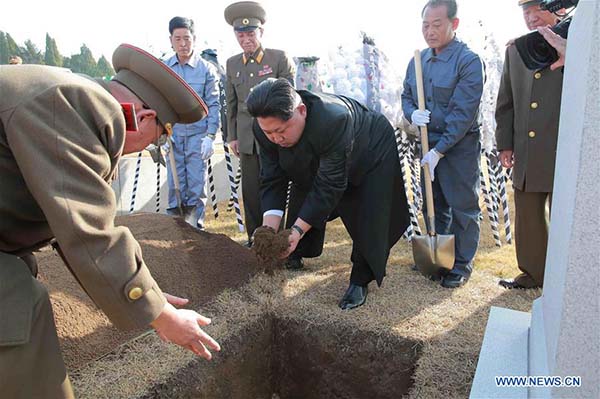 Foto fornecida pela KCNA no dia 12 de novembro de 2015 mostra o líder supremo da RPDC Kim Jong Um jogando terra na sepultura de Ra Uh Sol no Cemitério dos Mártires Revolucionários em Mt. Taesong, arredores de Pyongyang, na RPDC, em 11 de novembro de 2015. (Xinhua/KCNA)