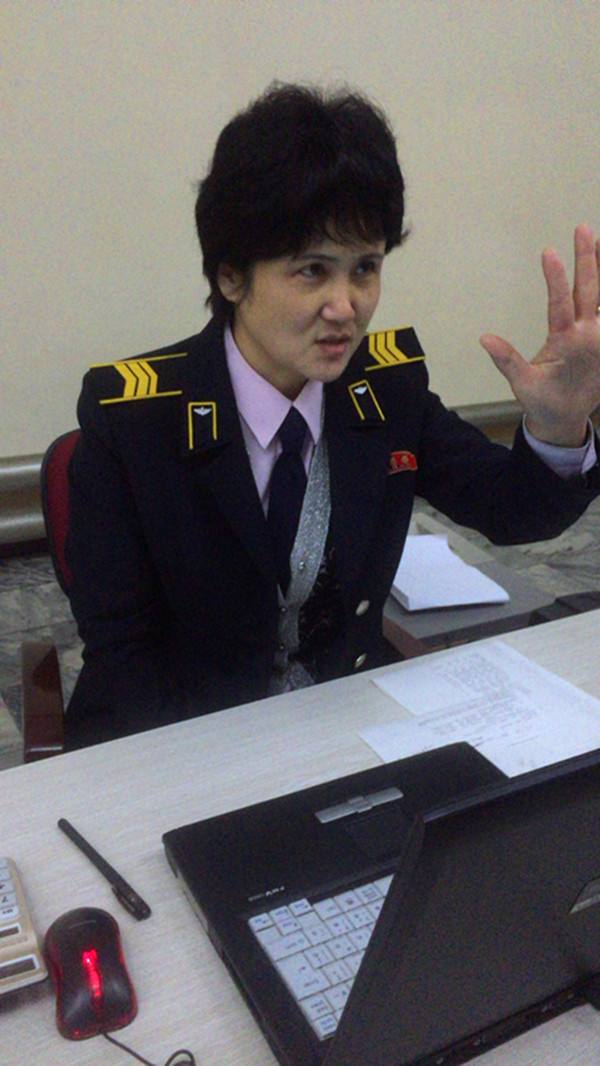Funcionária de bilheteira da Air Koryo apresenta as condi??es do programa