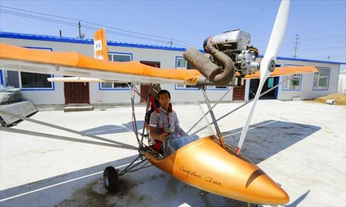 Yang Shijun, da província de Jilin testa o seu “jato caseiro”, que lhe custou 100,000 yuans. O jato pesa 110kg, tem 5 metros de comprimento, e uma extens?o de 9.5 metros entre as asas.