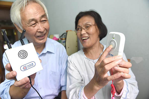 5 - Um casal mostra dispositivos portáteis que podem fazer chamadas de emergência ao hospital e contatar com membros da família se eles precisarem de ajuda, em Hefei, na Província de Anhui, em 29 de dezembro de 2015.