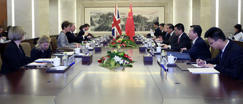 Wang disse que a China aprecia o fato de que o Reino Unido trabalhe para acelerar a negocia??o de um acordo de investimento China-Uni?o Europeia (UE) e para come?ar a pesquisa de viabilidade de uma zona de livre comércio China-UE o mais cedo possível.