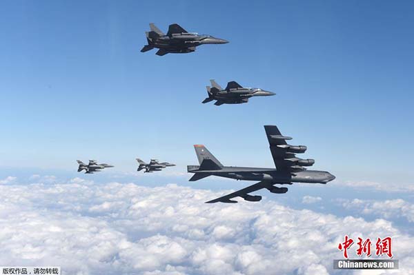 O B-52, um bombardeiro capaz de carregar um míssil nuclear, voltou à base de Guam após ter sobrevoado a base aérea em Osan, 40km a sul de Seul, em resposta ao quarto teste nuclear a RPDC.