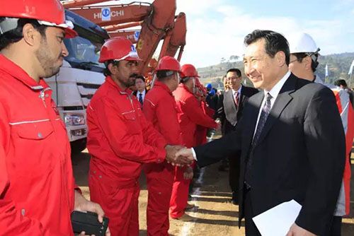 O presidente da Corpora??o das Três Gargantas, Lu Chun, se encontra com funcionários que trabalham na constru??o da usina hidrelétrica de Karot.