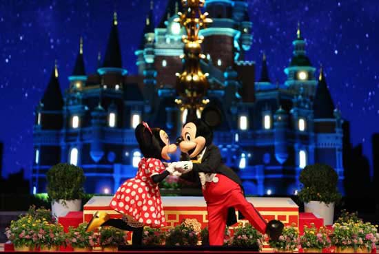 Personagens como Mickey e Minnie dan?am na cerim?nia de lan?amento do projeto do resort da Disney em Shanghai, no 15 de julho de 2015. [Foto/Xinhua]
