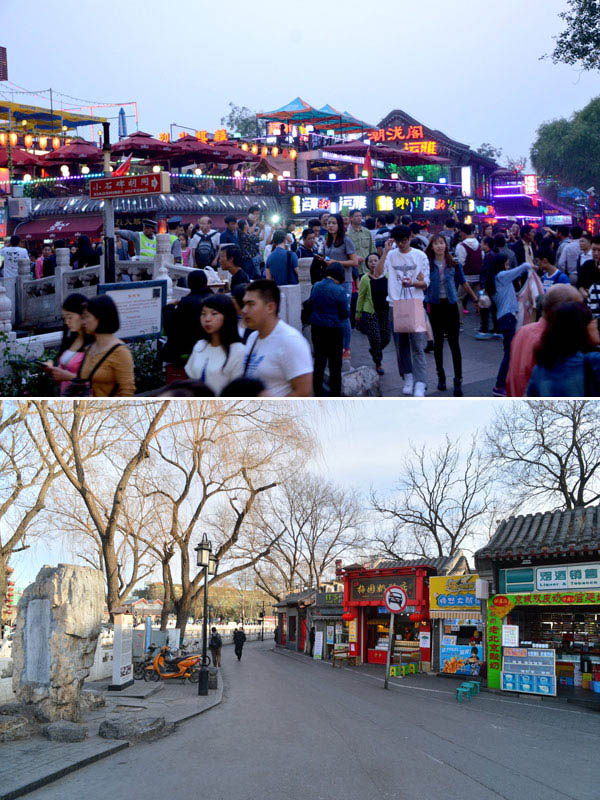 Combina??o de fotos apresenta Shichahai, um local turístico em Beijing, através das suas ruas de bares e vista para o lago. As fotografias foram tiradas a 4 de outubro e de fevereiro respetivamente.