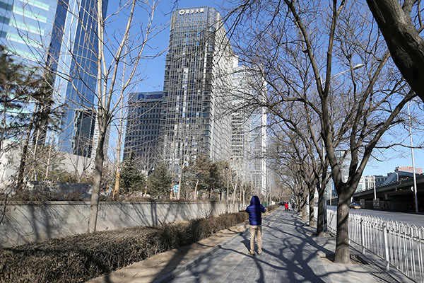 Uma rua vazia no centro financeiro de Guomao em Beijing. Fotografia do dia 5 de fevereiro de 2016.