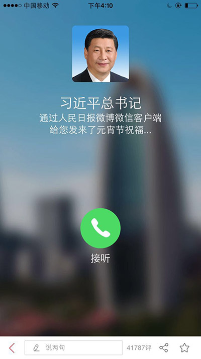 O presidente assumiu o teclado, onde deu ordem de grava??o de um discurso onde deseja a todos um feliz Festival das Lanternas. O discurso foi imediatamente difundido através das várias plataformas de comunica??o descritas. Logo após esse momento, o discurso ficou acessível aos internautas, que acorreram a clicar para ouvir as palavras de Xi.