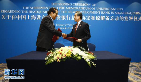 O ministro das Rela??es Exteriores chinês, Wang Yi, assinou um acordo com o presidente do banco, K.V. Kamath, que firmou um Memorando de Entendimento com o prefeito de Shanghai, Yang Xiong.