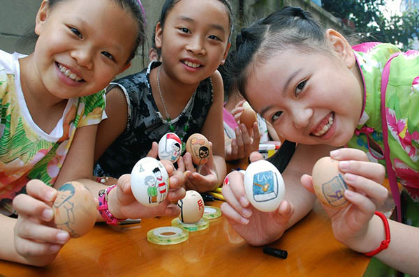 Os estudantes da escola primária da comunidade Jinshan, na cidade de Zhenjiang, província de Jiangsu, ilustram ovos com alguns dos valores socialistas.