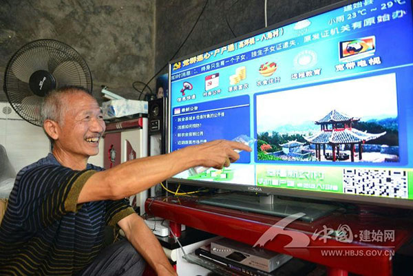 Depois da instala??o recente da rede de fibra óptica de alta velocidade no condado de Jianshi da cidade de Enshi, na província de Hubei, plataformas de servi?os e de internet como TV, computador e celular foram instaladas. A foto mostra o camponês Huang Zhiqiang utilizando a internet pela televis?o da sua casa.