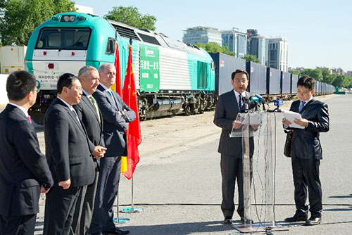 A 18 de maio de 2015, o comboio (trem) especial de transporte de vinho tinto com partida da esta??o ferroviária de contentores Abro?igal, em Madrid, conecta a capital espanhola à cidade chinesa de Yiwu. Na imagem, o embaixador chinês em Espanha e um representante da operadora dos caminhos-de-ferro de Espanha comparecem à cerimónia da partida do comboio.