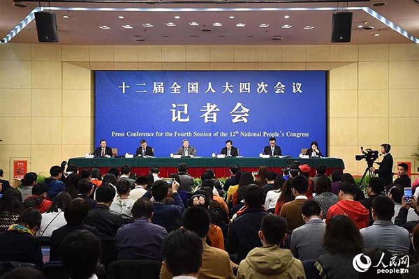 A 4a Sess?o da 12a Assembleia Popular Nacional realiza uma coletiva de imprensa sobre reforma e desenvolvimento financeiro no dia 12 de mar?o. [Foto/Diário do Povo Online/Yu Kai]