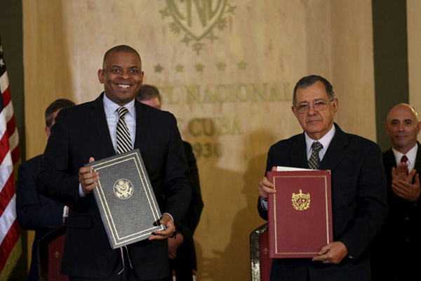 Secretário de Transportes dos EUA, Anthony Foxx (Esquerda) e o Ministro dos Transportes de Cuba, Adel Rodriguez, mostram pastas contendo os documentos para a retomada dos servi?os aéreos regulares entre os dois países, em Havana, 16 de fevereiro de 2016. [Foto / Agências]