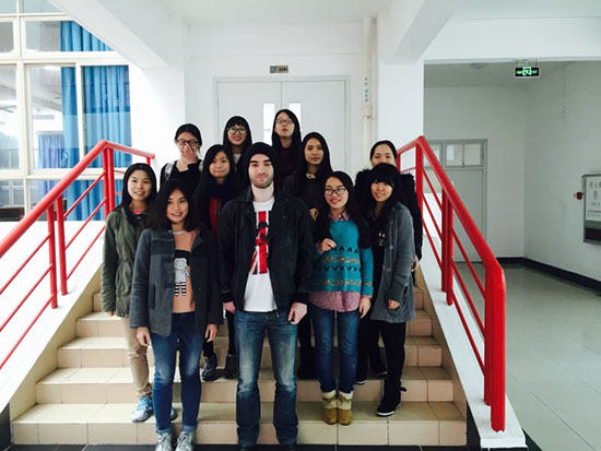 Sérgio com alguns dos seus alunos da Universidade Sun Yat-sen. A prevalência do sexo feminino nas turmas de línguas na China é especialmente forte. Por coincidência os rapazes n?o puderam comparecer para a foto.