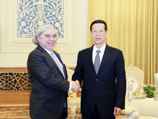 Zhang disse esperar coopera??o mais próxima e prática em energia nuclear, rede de eletricidade, energia limpa e cidades de baixo carbono, para ajudar nos esfor?os globais de se obter um desenvolvimento sustentável e lidar com a mudan?a climática.
