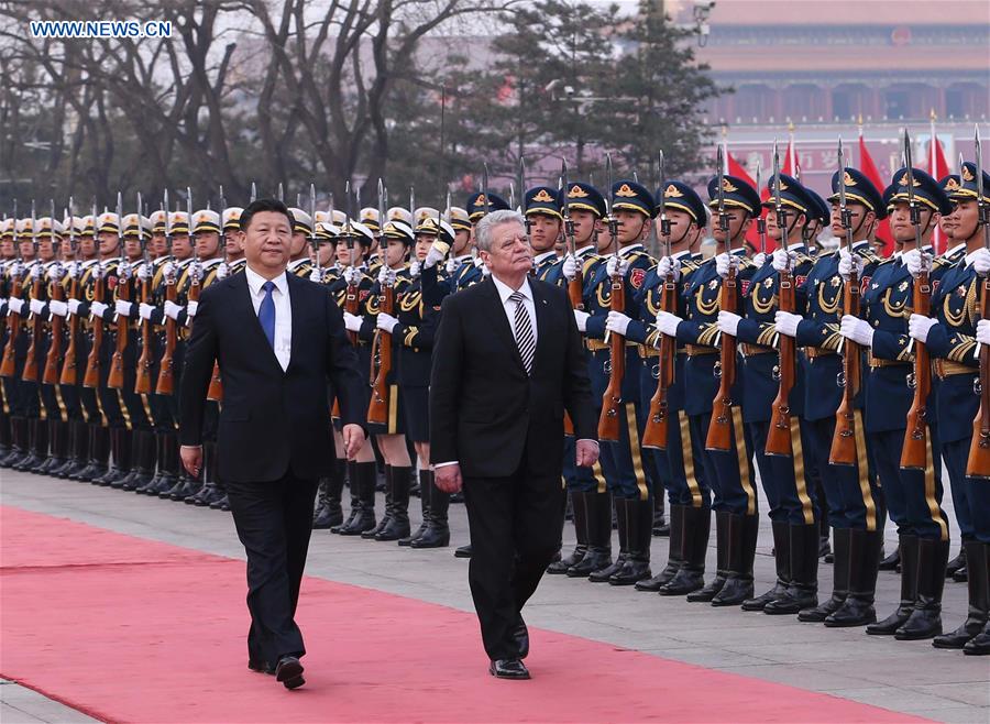 Xi Jinping, juntamente com Joachim Gauck participam numa cerimónia de boas-vindas ao líder alem?o antes de dar início às conversa??es no Grande Sal?o do Povo.