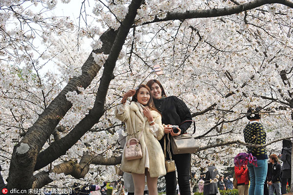 Multid?es de pessoas dirigem-se aos jardins da Universidade de Wuhan, capital da província de Hubei.