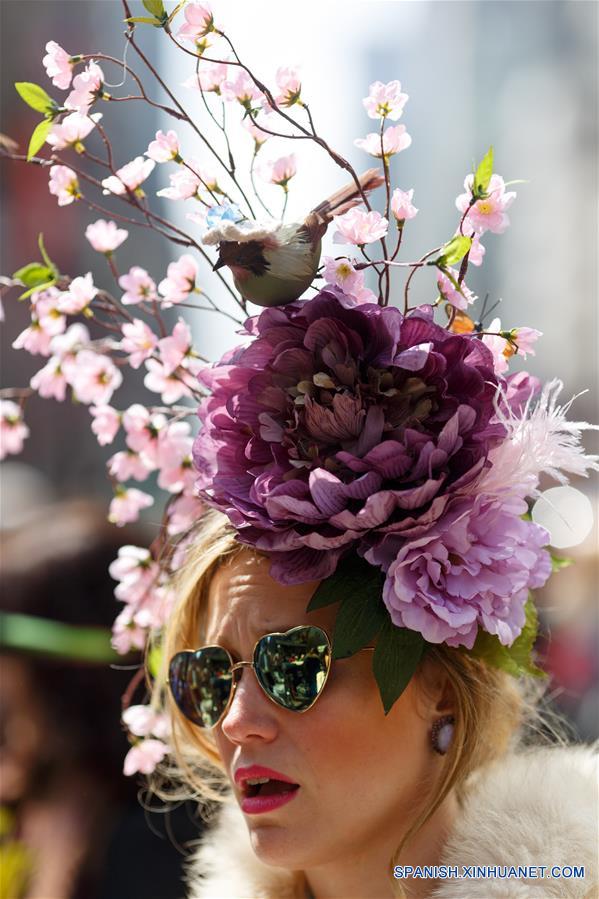 Uma mulher veste um chapéu decorativo durante o desfile anual de Páscoa celebrado na Quinta Avenida em Manhattan, Nova Iorque, no dia 27 de mar?o.Com uma história de mais de 100 anos, o desfile ocorre todos os anos na Quinta Avenida. Adultos, crian?as e mascotes com gorros e trajes coloridos participaram no evento, que atraiu milhares de turistas e moradores locais. (Xinhua/Li Muzi)