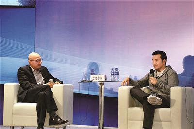 Vice-presidente da Dire??o ásia-pacífica da Motion Picture Association, Feng Wei (esquerda), conversa com o diretor de Hollywood, Lin Yibin