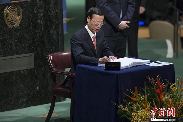 O vice-primeiro-ministro chinês Zhang Gaoli, enviado especial do presidente Xi Jinping, subiu ao pódio no Sal?o da Assembleia Geral das Na??es Unidas para assinar o importante documento.