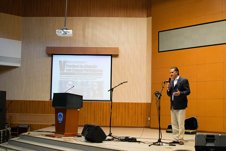 BEIJING,9 de mai (Diário do Povo Online) - A Universidade de Estudos Estrangeiros de Beijing acolheu no dia 8 de maio a quinta edi??o do Festival da Can??o em Língua Portuguesa. Vários estudantes de português, provenientes de diversas universidades, participaram num concurso cheio de boa disposi??o e de bons momentos musicais. O concurso, que se insere no programa de atividades comemorativas do Dia da Língua Portuguesa, contou também com a presen?a de Jorge Torres Pereira, o embaixador de Portugal na China, e com o grupo musical português Senza, que, além de atuar em nome próprio, acompanhou ainda um dos concorrentes.