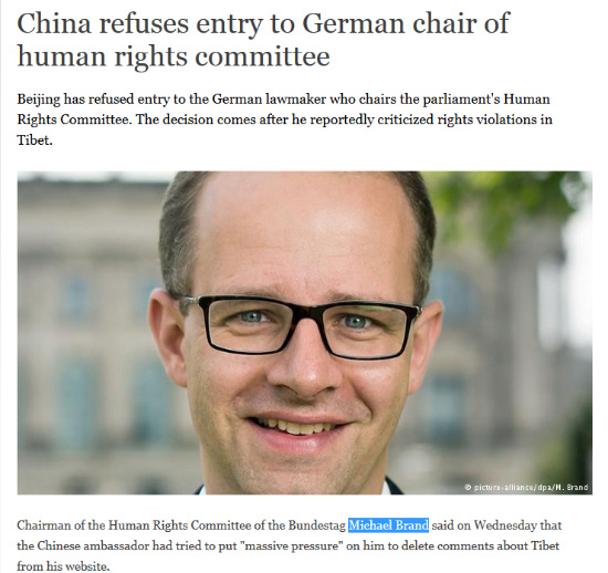 Michael Brand, presidente do Comitê sobre Direitos Humanos e Assistência Humanitária do Bundestag alem?o, camara baixa do Parlamento alem?o, n?o é bem-vindo na China, disse Lu Kang, porta-voz da chancelaria, em uma entrevista coletiva diária.