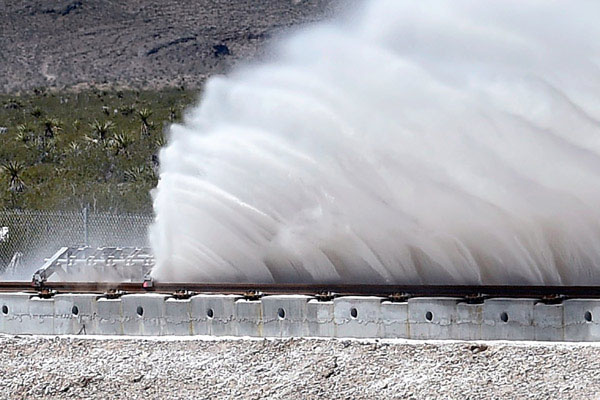 Areia é deslocada durante o primeiro teste do sistema de propuls?o Hyperloop no dia 11 de Maio de 2016, em Nevada. A empresa pretende criar um sistema hyperloop totalmente operacional até 2020 [Foto/VCG]