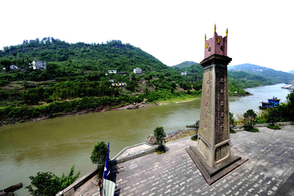 Foto mostra um monumento em homenagem à balsa que o Exército Vermelho usou para atravessar o Rio Chishui em Taiping, província de Sichuan.