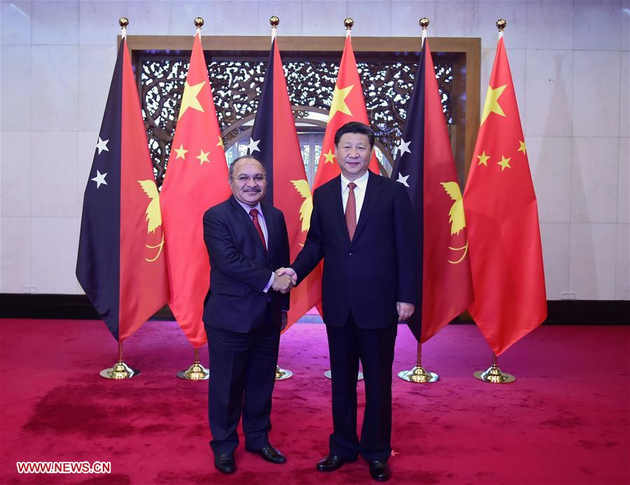 O país defende que as disputas marítimas relevantes sejam resolvidas de forma pacífica pelas partes diretamente relacionadas através de consultas e negocia??es e conforme a lei internacional, segundo um comunicado binacional emitido depois do encontro no Grande Palácio do Povo entre o presidente Xi Jinping e o primeiro-ministro Peter O'Neill, que está de visita à China