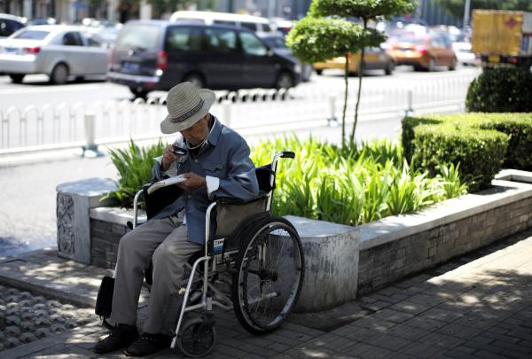 Um idoso chinês lê o livro na cadeira sobre roda, em Beijing