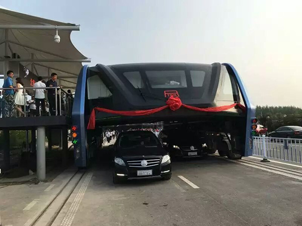 O ?nibus suspenso se parece com um ?nibus gigante de dois andares, que, no entanto, permite que os carros passem debaixo dele.