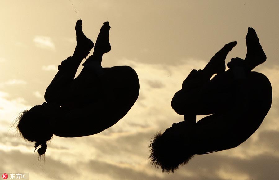 A atleta chinesa, Chen Ruolin (esquerda) e Liu Huixia, competem na final dos saltos sincronizados plataforma 10m.