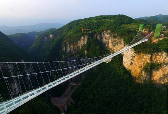 A ponte com 430 metros de comprimento e 6 metros de amplid?o, pavimentada com 99 vidra?as transparentes de três camadas, liga dois penhascos íngremes a 300 metros de altura.