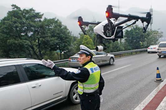 Os drones podem identificar placas de veículos de 100 metros de distancia. As imagens e vídeos foram enviados para ajudar a polícia a tomar medidas eficazes para controlar o fluxo de transito.