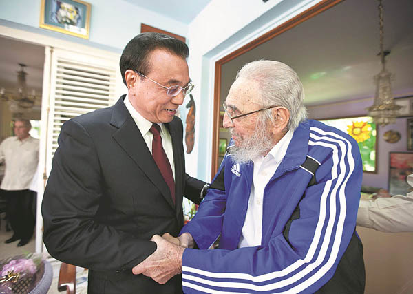 O Premiê chinês, Li Keqiang, encontrou-se com Fidel Castro, o líder nonagenário da revolu??o cubana, no domingo, durante a sua visita ao país numa demonstra??o de respeito pelo revolucionário.