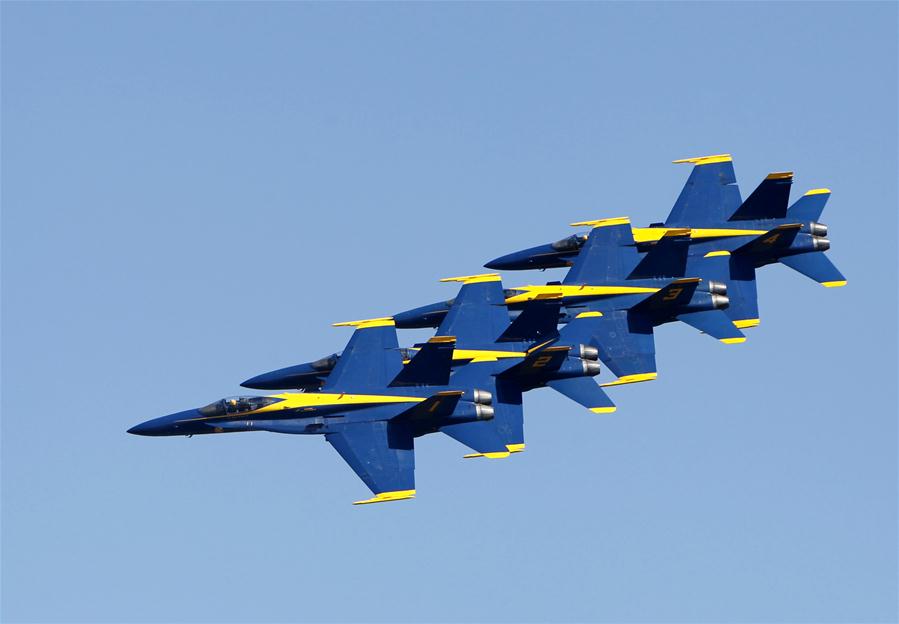 Membros da equipe "Anjos Azuis" da Marinha estadunidense, realizam uma manobra durante o Espetáculo Aéreo de Houston, no aeroporto de Ellington, em Houston, Estados Unidos da América, em 22 de outubro de 2016. (Xinhua/Song Qiong)
