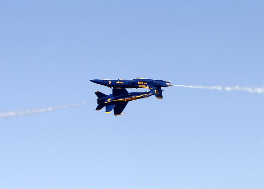 Membros da equipe "Anjos Azuis" da Marinha estadunidense, realizam uma manobra durante o Espetáculo Aéreo de Houston, no aeroporto de Ellington, em Houston, Estados Unidos da América, em 22 de outubro de 2016. (Xinhua/Song Qiong)