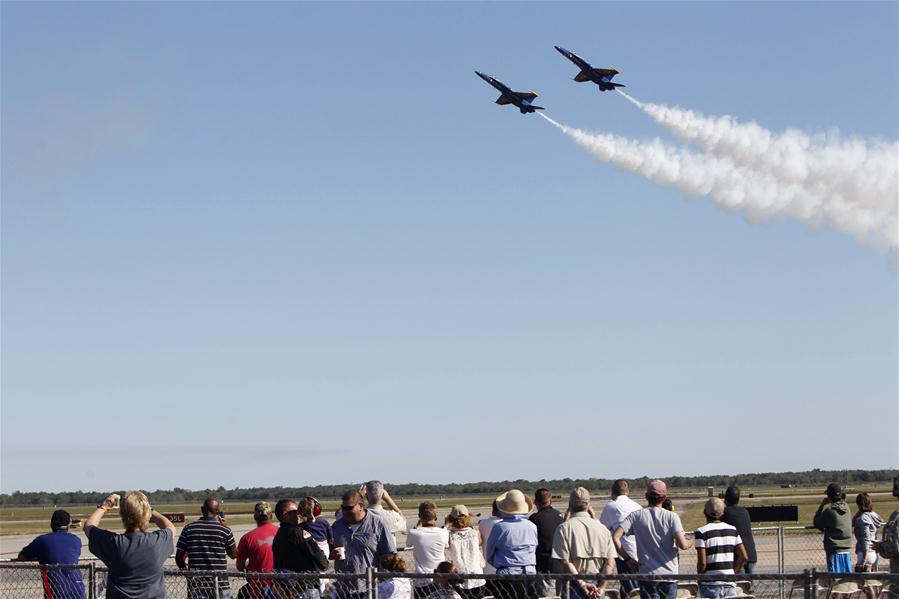 Membros da equipe "Anjos Azuis" da Marinha estadunidense, realizam uma manobra durante o Espetáculo Aéreo de Houston, no aeroporto de Ellington, em Houston, Estados Unidos da América, em 22 de outubro de 2016. (Xinhua/Song Qiong)