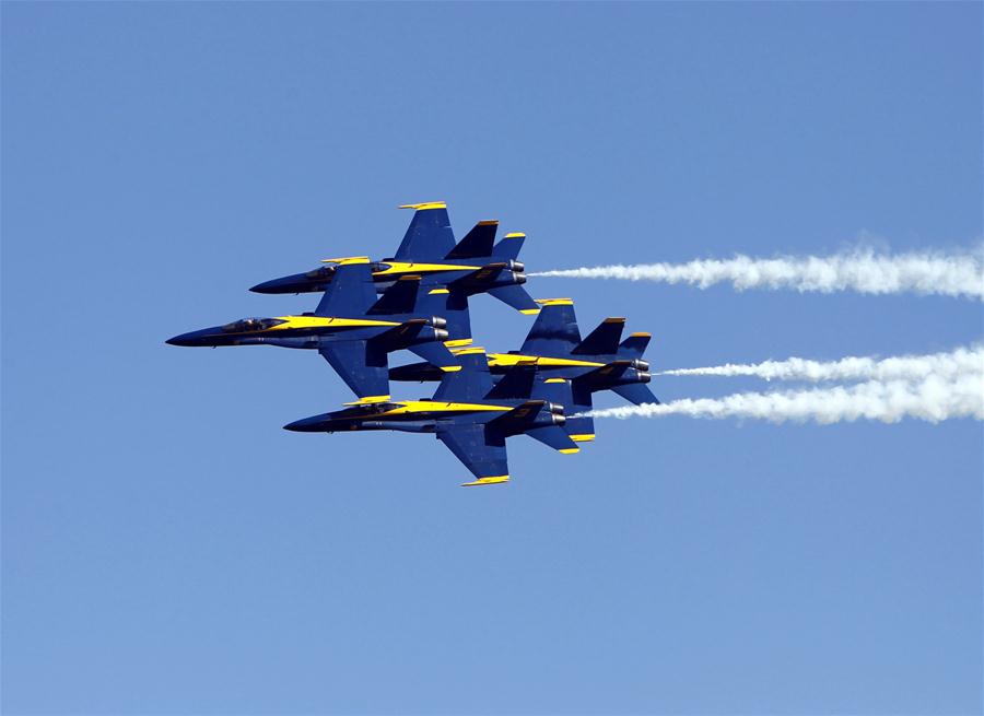 Membros da equipe "Anjos Azuis" da Marinha estadunidense, realizam uma manobra durante o Espetáculo Aéreo de Houston, no aeroporto de Ellington, em Houston, Estados Unidos da América, em 22 de outubro de 2016. (Xinhua/Song Qiong)