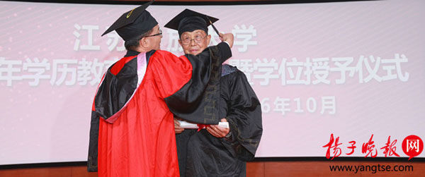 Zhang Guohuan (à direita), de 88 anos, recebe o seu diploma de conclus?o de licenciatura pela Universidade Aberta de Jiangsu, em Nanjing, a 21 de outubro de 2016.
