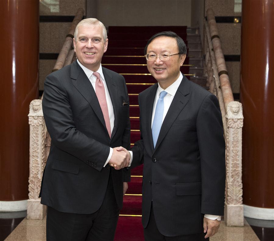 Beijing, 27 out (Xinhua) -- O conselheiro de Estado chinês Yang Jiechi se encontrou com o príncipe da Gr?-Bretanha Andrew em Beijing nesta quarta-feira, e afirmou que a China espera maior coopera??o e intercambios com o Reino Unido.
