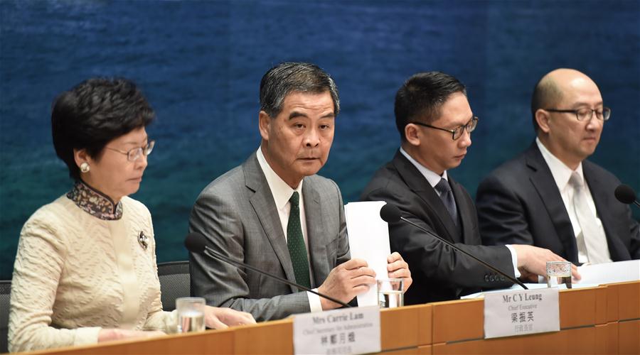 Acompanhado pelo secretário-chefe, Carrie Lam, o secretário de justi?a, Rimsky Yuen, e o secretário para assuntos constitucionais e com a parte continental chinesa, Raymond Tam, o chefe do Executivo afirmou que qualquer a??o proposital de violar a Lei Básica e ofender a na??o chinesa deverá ser contida e punida de acordo com a lei.