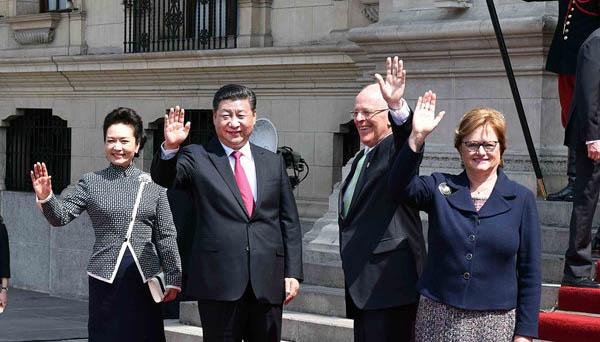 Xi Jinping e a primeira-dama Peng Liyuan, juntamente com os seus homólogos peruanos, Pedro Pablo Kuczynski e Nancy Lange, diante do palácio presidencial em Lima, no Peru.